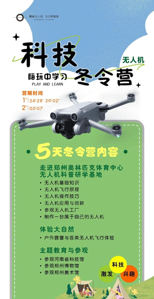 鄭州奧體翼能無人機研學基地是集無人機科普、研學、開發(fā)、應用、賽事運營的綜合服務平臺,不僅擁有1000余平方米的無人機科普教育基地,還擁有無人機駕駛執(zhí)照的培訓資格。寒假期間,依托鄭州奧體中心開闊場館,翼能無人機將科普知識與實操表演完美結合,分別開設1至5天不等的科技冬令營,代領孩子們放飛科技夢,在嗨玩中學習。