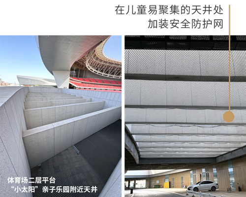 快樂成長,安全為先。為了確保兒童游樂區(qū)的安全,鄭州奧體中心從細節(jié)處著手精心加裝了多種防護裝置,在奧體中心西北角區(qū)域加裝隔離花箱、石墩,確保行人與機動車分離。同時,在體育場二層平臺兒童聚集較多的天井內,加裝防護網(wǎng);在健身器材一側加裝防護欄;在通往二層平臺的步梯兩側加裝防滑球......這些防護裝置均經(jīng)過嚴格的現(xiàn)場論證和質量檢測,確保其具有優(yōu)異的耐用性和穩(wěn)定性。通過這些措施,鄭州奧體中心致力于為孩子們打造一個既充滿樂趣,又安全無虞的游樂環(huán)境。