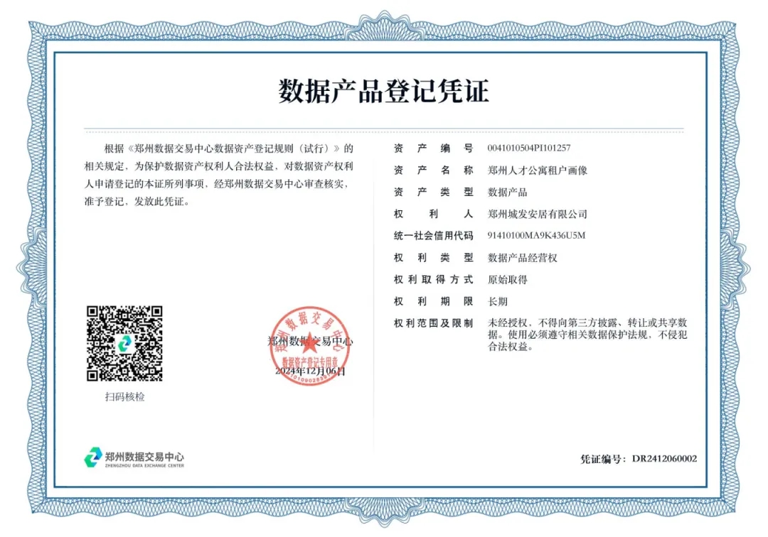 12月6日,鄭州城市發(fā)展集團有限公司下屬子公司鄭州城發(fā)安居有限公司(以下簡稱“城發(fā)安居”)在鄭州數(shù)據(jù)交易中心成功完成了“鄭州人才公寓租戶畫像”的資產(chǎn)登記,正式取得數(shù)據(jù)產(chǎn)品登記憑證,成為鄭州首例將人才公寓運營數(shù)據(jù)資產(chǎn)入表的市屬國企。