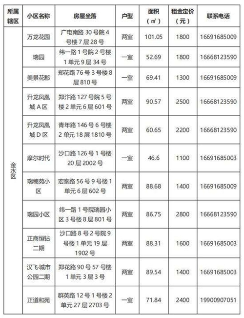本批次配租房源共計(jì)32套,其中金水區(qū)12套、管城區(qū)7套、二七區(qū)8套、中原區(qū)1套、鄭東新區(qū)3套、惠濟(jì)區(qū)1套。水電費(fèi)均為民用水電標(biāo)準(zhǔn),物業(yè)費(fèi)為各小區(qū)物業(yè)收費(fèi)標(biāo)準(zhǔn),房源精裝修交付,周邊配套設(shè)施齊全,配備家具家電,拎包入住,后續(xù)房源將根據(jù)裝修進(jìn)度情況陸續(xù)配租。