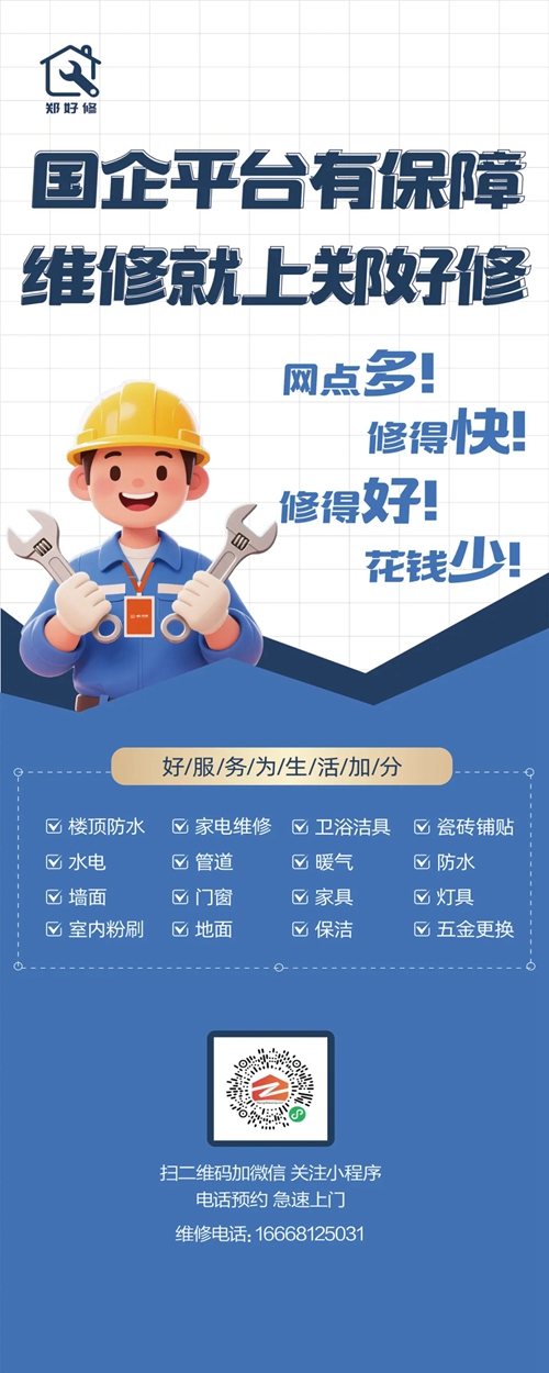 為切實解決群眾房屋維修難題,推動鄭州市維修服務(wù)業(yè)邁向標(biāo)準(zhǔn)化、透明化、便捷化發(fā)展新征程,由鄭州城發(fā)集團(tuán)下屬子公司鄭州城發(fā)安居科技有限公司精心打造的“鄭好修”服務(wù)平臺,正式上線運(yùn)營。市民通過鄭州安居微信小程序、鄭州安居微信服務(wù)號,即可輕松實現(xiàn)一鍵報修,享受優(yōu)質(zhì)高效的房屋維修服務(wù)。