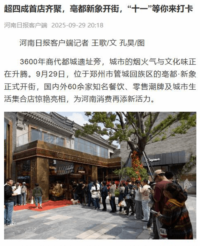 9月29日,備受矚目的城市更新標(biāo)桿項(xiàng)目——鄭州“亳都·新象”商業(yè)街區(qū)正式開(kāi)街迎客。憑借著獨(dú)特的文化魅力與商業(yè)風(fēng)格,開(kāi)街首日,街區(qū)人潮涌動(dòng),客流量突破10萬(wàn)人次,項(xiàng)目取得了1億+的線上累計(jì)曝光量。不僅銷售業(yè)績(jī)表現(xiàn)亮眼,取得了轟動(dòng)性的開(kāi)門(mén)紅,也收到了業(yè)界專家發(fā)來(lái)的賀詞和眾多媒體的報(bào)道。