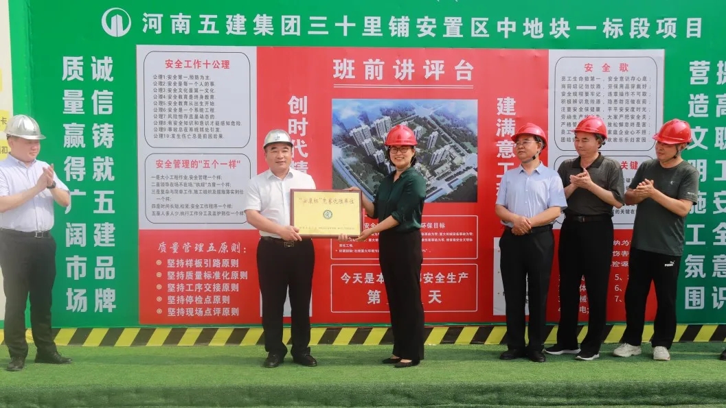 6月2日下午,鄭州市總工會(huì)機(jī)關(guān)工會(huì)主任王銀倉、市總工會(huì)勞動(dòng)和經(jīng)濟(jì)部部長宋慧分別向集團(tuán)兩家獲獎(jiǎng)公司頒發(fā)鄭州市“安康杯”競賽優(yōu)勝單位獎(jiǎng)牌。